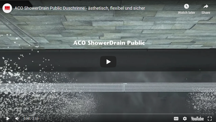 ACO ShowerDrain Public duširenn on mõeldud kasutamiseks avalikes ruumides. See on saadaval kahes siselaiuses - 80 mm ja 110 mm ning vastab standarditele DIN 18534 ja EN 1253-1
